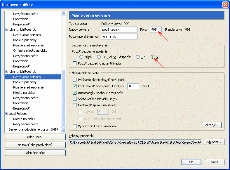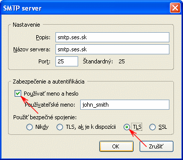 - Zadajte adresu servera pre odosielanie pošty - smtp.ses.sk.