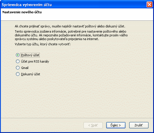 - Zvoľte typ konta - IMAP alebo POP3 - rozdiel je popísaný vyššie.