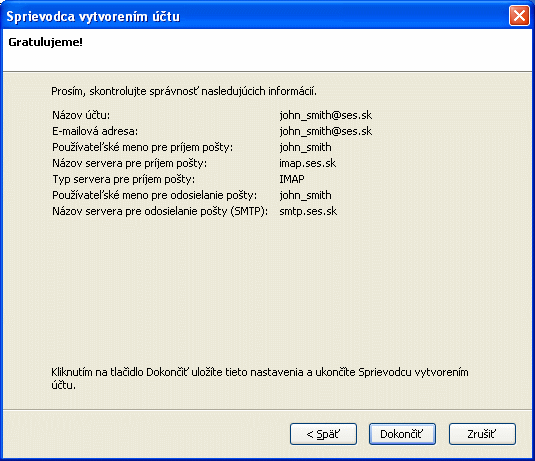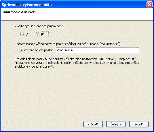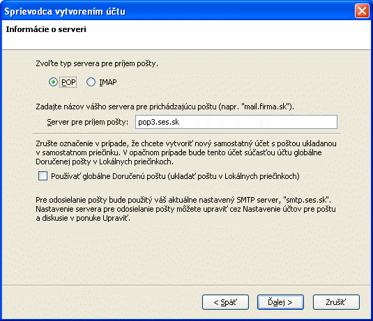 | Server odchádzajúcej pošty - protokol SMTP: | smtp.ses.sk |